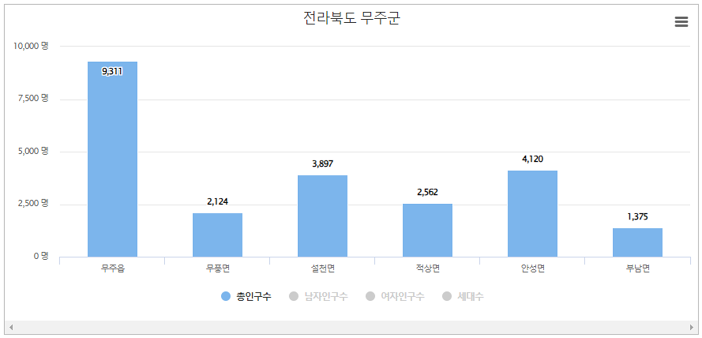 무주군에서 무주읍 인구가 가장 많으며 인구는 9,311명, 세대수는 4,633입니다. 두번째로는 안성면 인구가 많고 인구 4,120명, 세대수는 2,414입니다. 세번째는 설천면으로 인구는 3,897, 세대수는 2,234입니다.