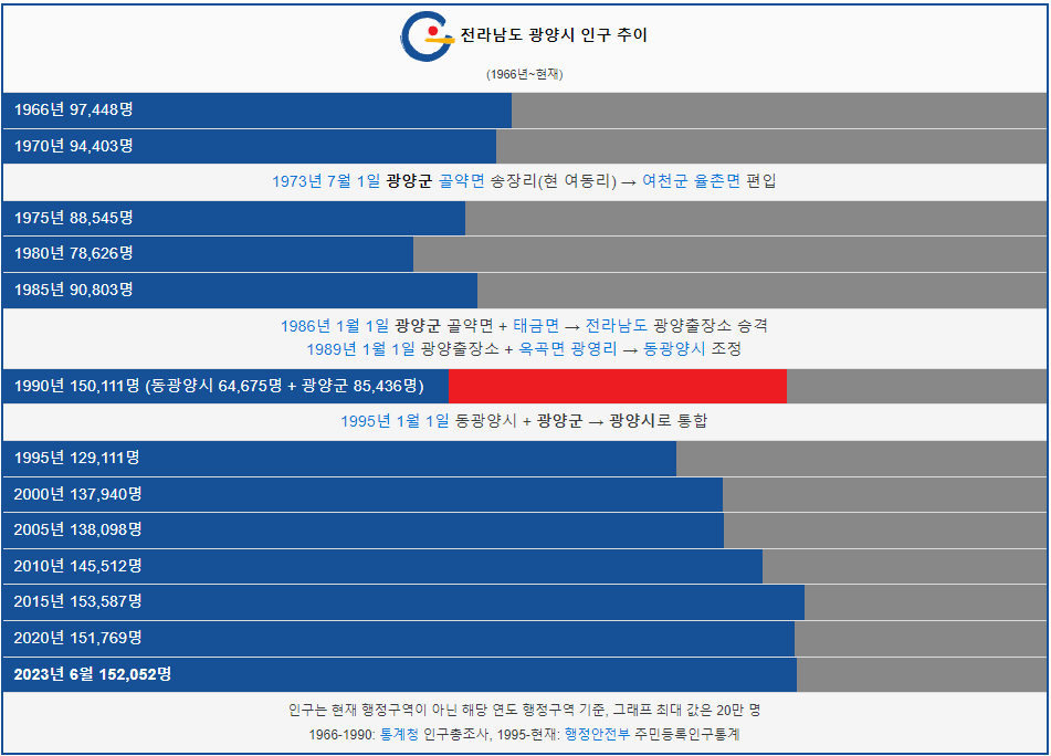 광양시 인구는 1966년 9만명 이었습니다. 그리고 1990년 동광양시와 광양군이 광양시로 통합되면서 처음으로 15만명을 돌파했고 이후 크게 인구변화가 없었습니다. 2023년 현재 15만명이 광양시에 거주하고 있습니다.