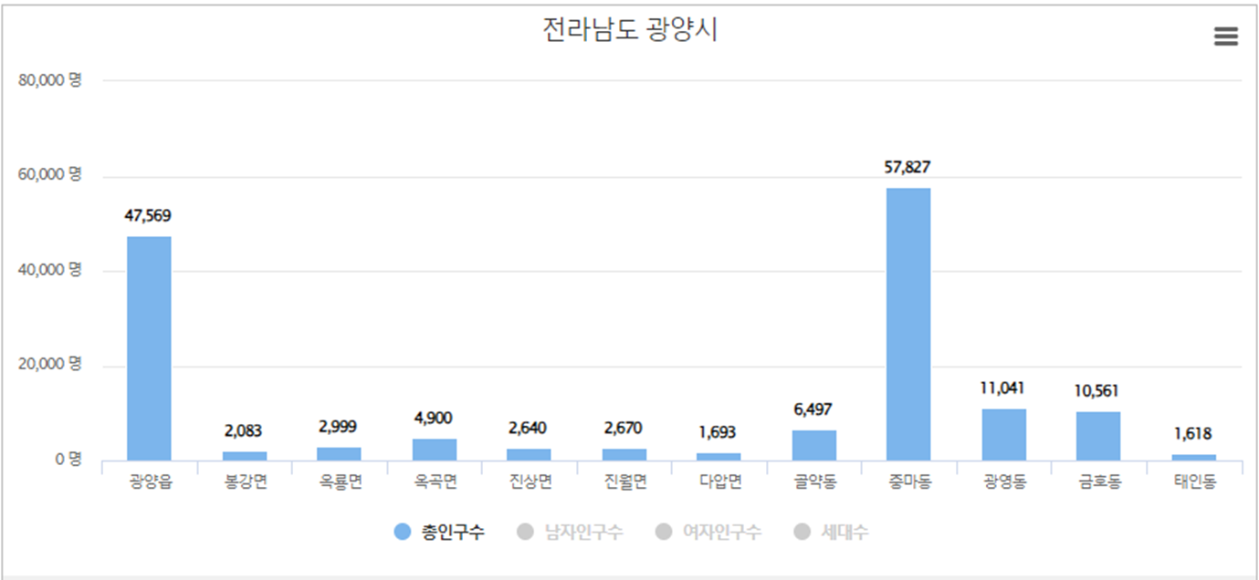 광양시에서 중마동 인구가 가장 많으며 인구는 57,827명, 세대수는 24,620입니다. 두번째로는 광양읍 인구가 많고 인구 47,569명, 세대수는 21,733입니다. 세번째는 광영동으로 인구는 11,041, 세대수는 5,298입니다.