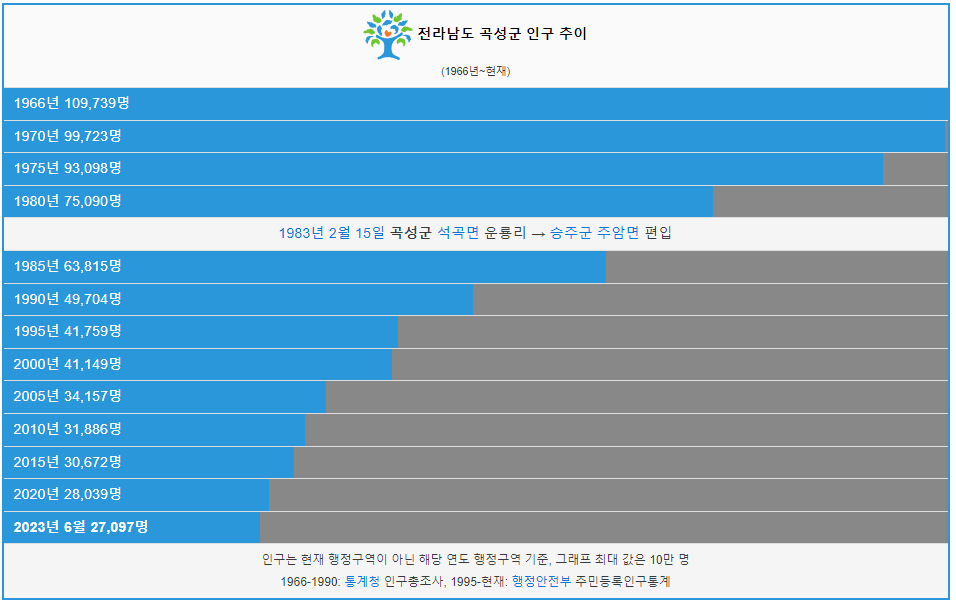 곡성군 인구는 1966년 10만명 이었습니다. 이후 인구 증가없이 계속해서 인구가 감소했습니다. 2023년 현재 2만명이 곡성군에 거주하고 있습니다.