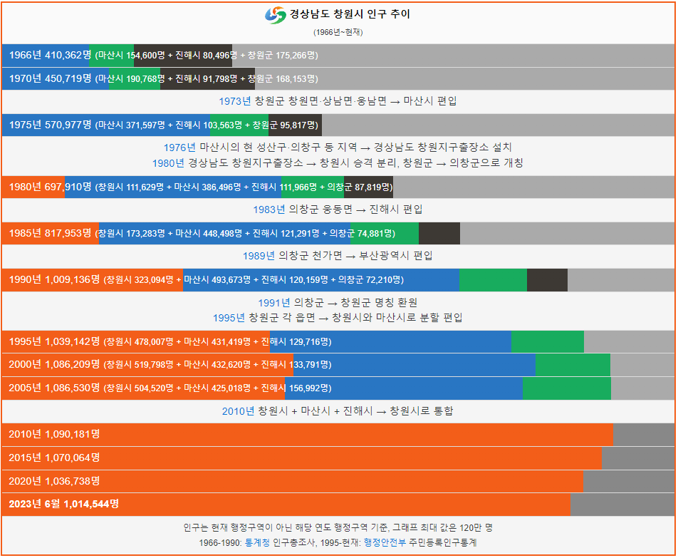 창원시(마산시+진해시+창원군) 인구는 1966년 41만명 이었습니다. 그리고 1990년 인구가 처음으로 100만명 이상이 되었고 이후 비슷한 인구수를 유지하고 있습니다. 2023년 현재 101만명이 창원시에 거주하고 있습니다.