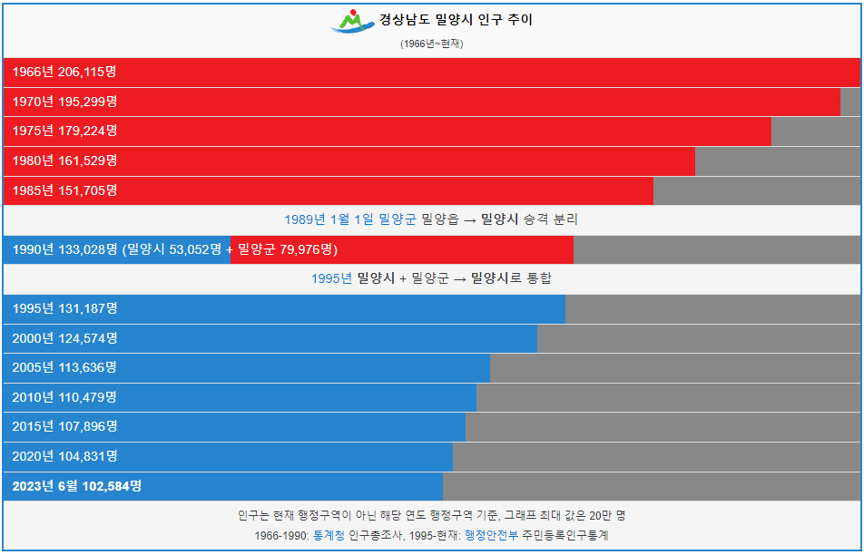 밀양시 인구는 1966년 20만명 이었습니다. 그리고 1990년 인구가 처음으로 15만명 이하로 감소했고 이후 인구가 계속해서 감소했습니다. 2023년 현재 10만명이 밀양시에 거주하고 있습니다.