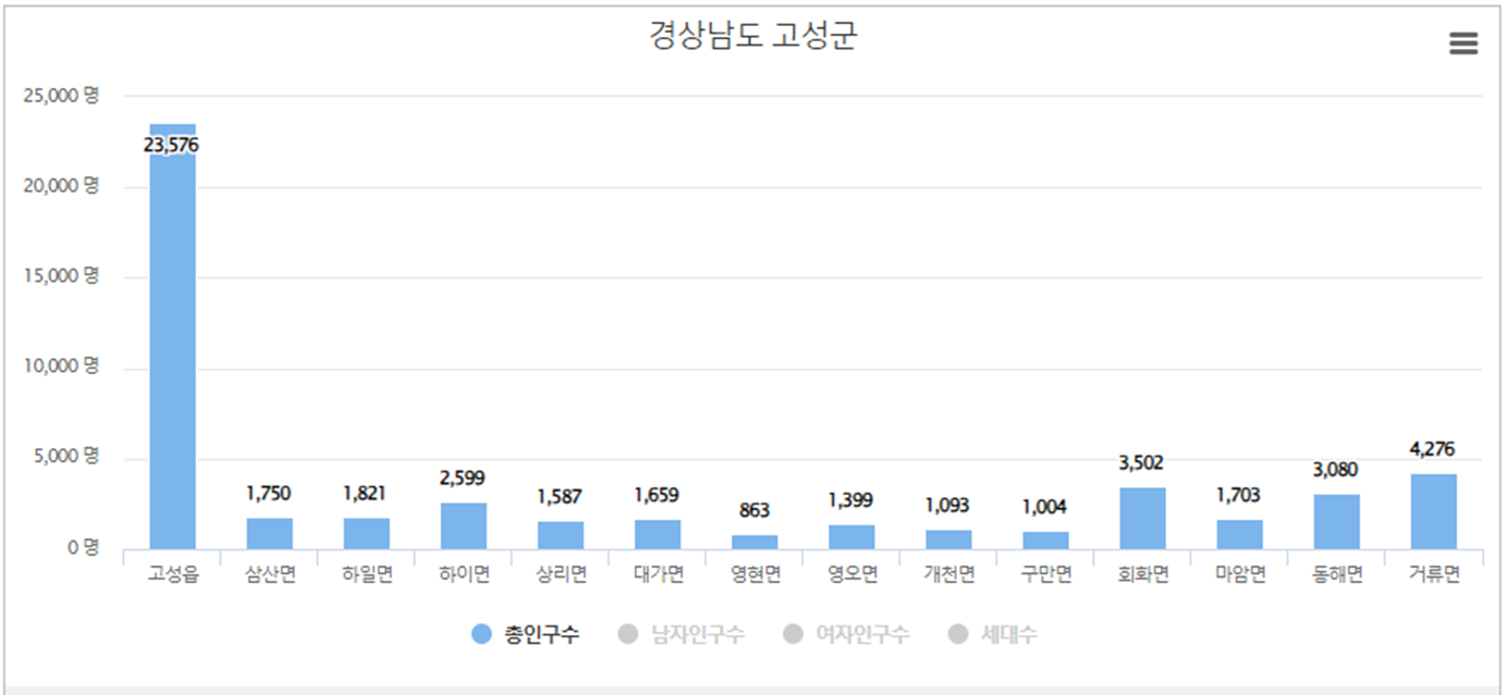 고성군에서 고성읍이 인구가 가장 많으며 인구는 23,576명, 세대수는 11,332입니다. 두번째로는 거류면 인구가 많고 인구 4,276명, 세대수는 2,450입니다. 세번째는 회화면으로 인구는 3,502, 세대수는 1,964입니다.
