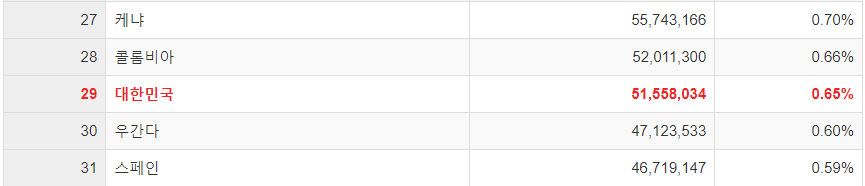 | 31 | 스페인 | 46,719,147 | 0.59% |