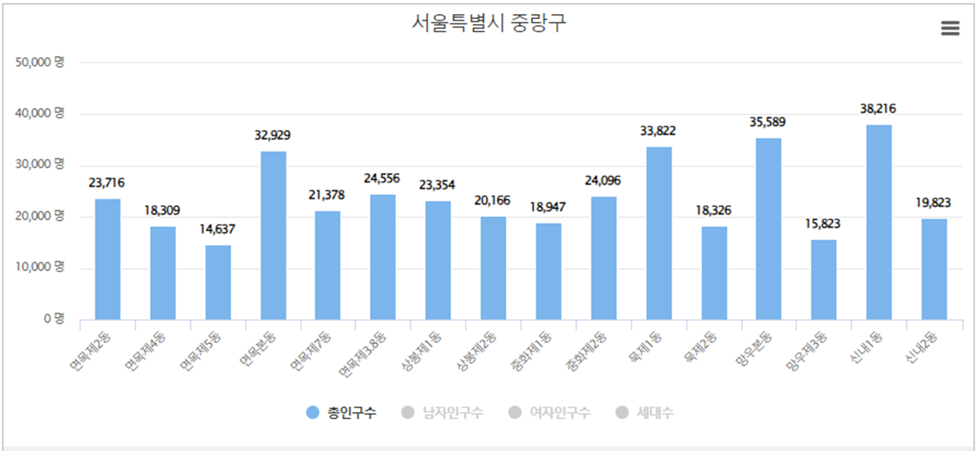 중랑구에서 신내1동이 인구가 가장 많으며 인구는 38,216명, 세대수는 14,950입니다. 두번째로는 망우본동 인구가 많고 인구 35,589명, 세대수는 17,726입니다. 세번째는 묵제1동으로 인구는 33,822, 세대수는 14,989입니다.