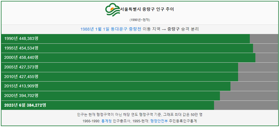 중랑구 인구는 1990년 44만명 이었습니다. 그리고 2000년 인구 45만 8천명으로 인구가 가장 많았고 이후 인구가 꾸준히 감소했습니다. 2023년 현재 38만명이 중랑구에 거주하고 있습니다.