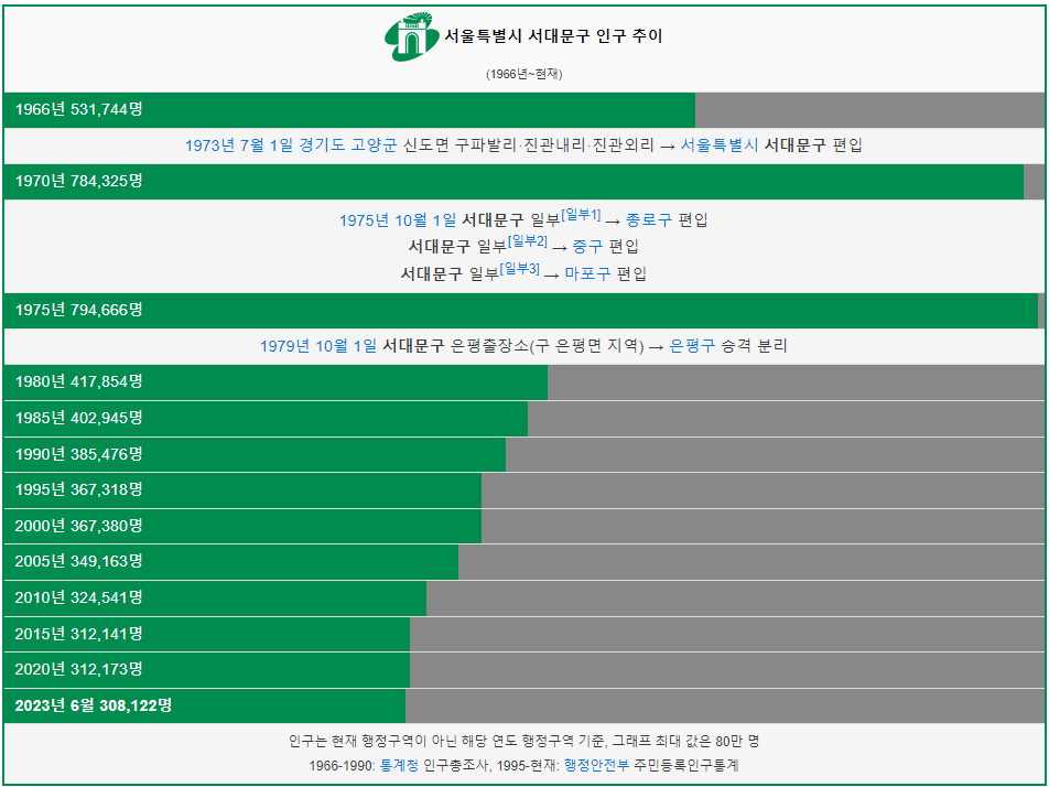 서대문구 인구는 1966년 53만명 이었습니다. 그리고 1975년 인구 79만명 이상이 됐고 이후 서대문구 은평출장소가 은평구로 승격 분리되었습니다. 이후 인구가 꾸준히 감소하였고 2023년 현재 30만명이 서대문구에 거주하고 있습니다.