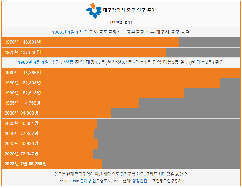 중구 인구는 1970년 14만명 이었습니다. 그리고 1980년 인구가 처음으로 21만명을 돌파했고 이후에 인구가 계속해서 감소했습니다. 2023년 현재 8만 5천명이 중구에 거주하고 있습니다.