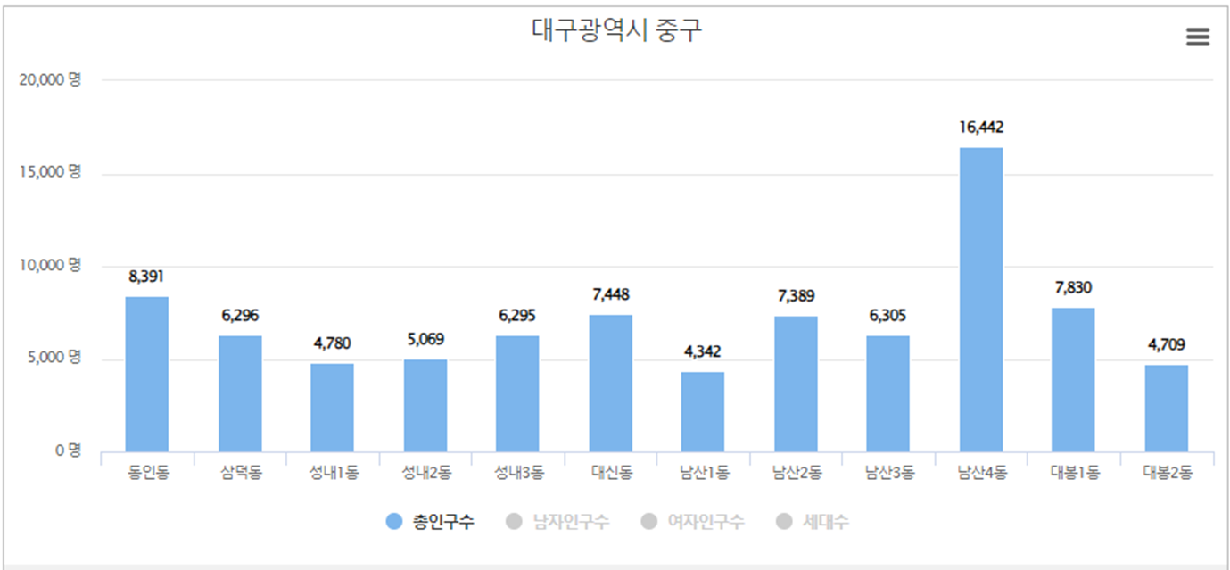 중구에서 남산4동이 인구가 가장 많으며 인구는 16,442명, 세대수는 6,880입니다. 두번째로는 동인동 인구가 많고 인구 8,391명, 세대수는 5,070입니다. 세번째는 대봉1동으로 인구는 7,830, 세대수는 3,584입니다.