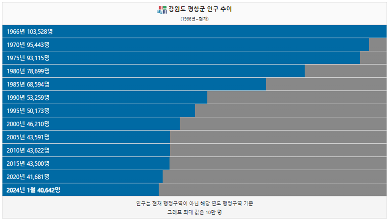 평창군 인구는 1966년 10만명 이었습니다. 이후 인구가 지속적으로 감소하여 2000년 처음으로 5만명 이하로 감소하였습니다. 2024년 현재 4만명이 평창군에 거주하고 있습니다.