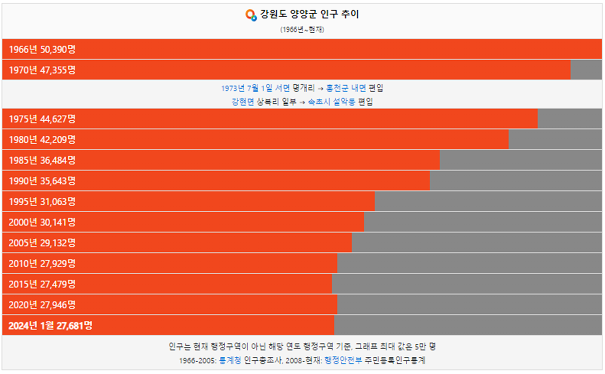 양양군 인구는 1966년 5만명 이었습니다. 이후 인구가 꾸준히 감소하였고 2005년 처음으로 3만명 이하의 인구가 거주하였습니다. 2024년 현재 2만명이 양양군에 거주하고 있습니다.