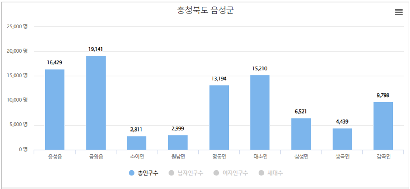 음성군에서 금왕읍 인구가 가장 많으며 인구는 19,141 명, 세대수는 10,212 입니다. 두번째로는 음성읍 인구가 많고 인구 16,429 명, 세대수는 8,730 입니다. 세번째는 대소면으로 인구는 15,210 명, 세대수는 7,890 입니다.