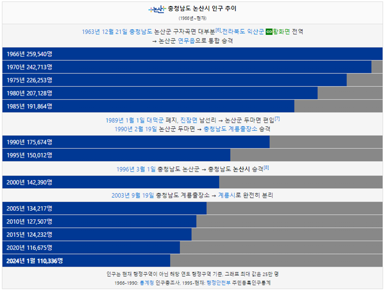 논산시 인구는 1966년 25만명 이었습니다. 그리고 2000년 인구가 처음으로 15만명 이하로 감소했고 이후에도 인구가 꾸준히 감소했습니다. 2024년 현재 11만명이 논산시에 거주하고 있습니다.