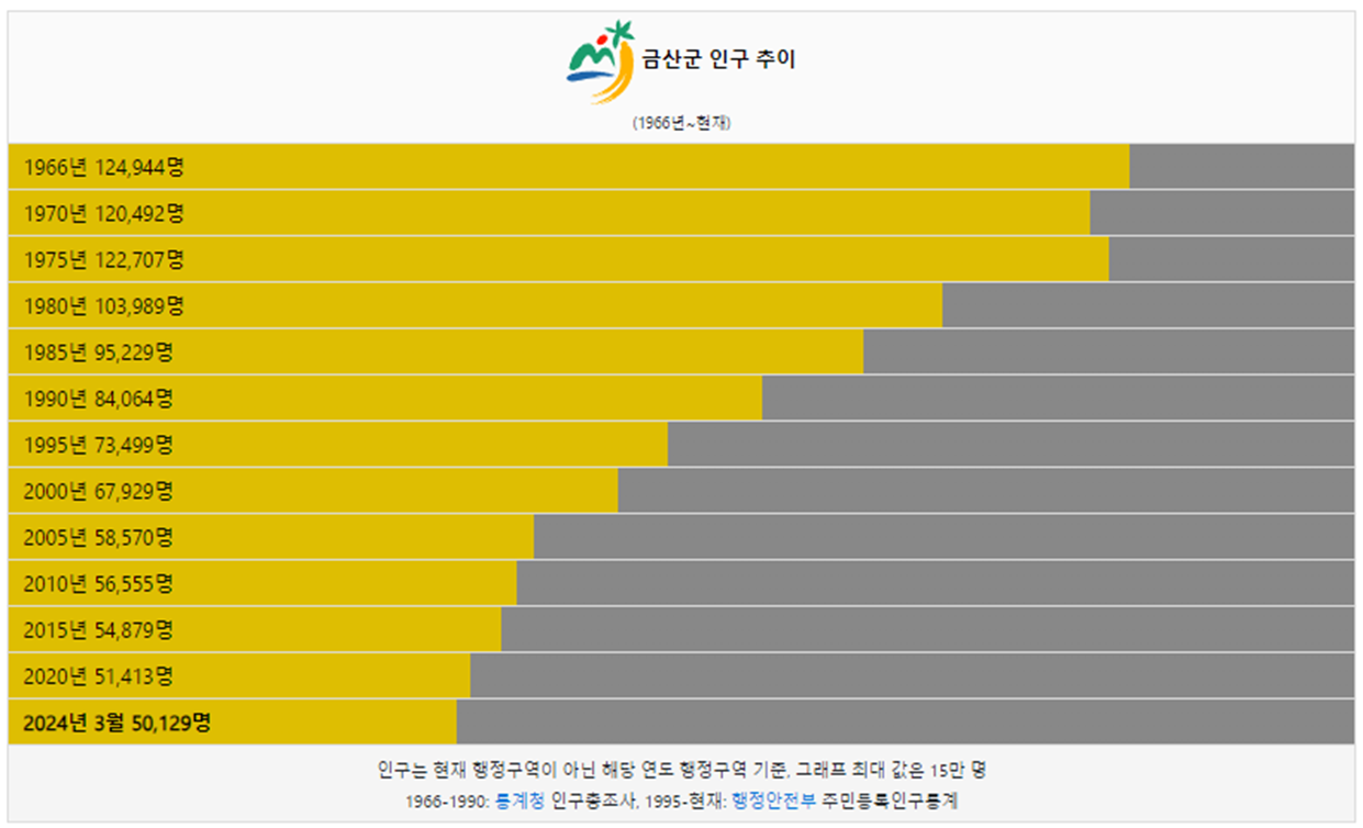 금산군 인구는 1966년 12만명 이었습니다. 그리고 1985년 처음으로 10만명 이하로 감소했고 이후에도 인구가 꾸준히 감소했습니다. 2024년 현재 5만명이 금산군에 거주하고 있습니다.