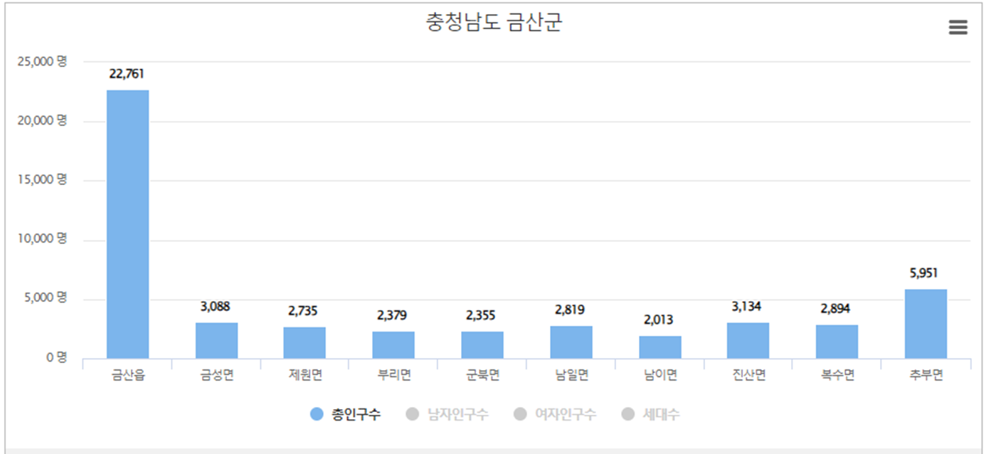 금산군에서 금산읍 인구가 가장 많으며 인구는 22,761 명, 세대수는 10,934 입니다. 두번째로는 추부면 인구가 많고 인구 5,951 명, 세대수는 3,482 입니다. 세번째는 진산면으로 인구는 3,134 명, 세대수는 1,891 입니다.