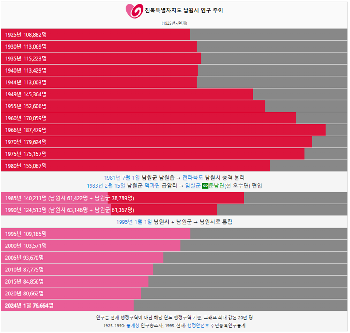 남원시 인구는 1925년 10만명 이었습니다. 그리고 1996년 18만명으로 가장 많은 인구가 거주했고 이후에는 인구가 꾸준히 감소했습니다. 2024년 현재 7만명이 남원시에 거주하고 있습니다.