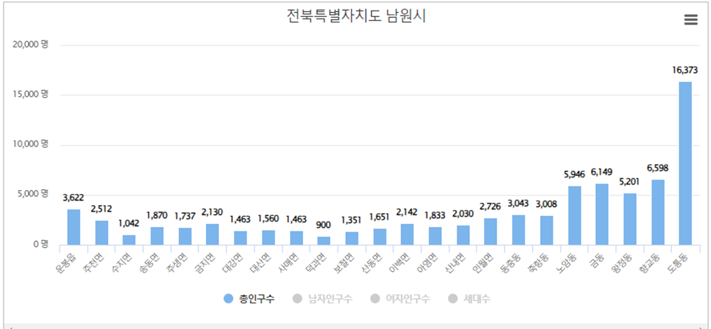 남원시에서 도통동 인구가 가장 많으며 인구는 16,373 명, 세대수는 7,223 입니다. 두번째로는 향교동 인구가 많고 인구 6,598 명, 세대수는 3,639 입니다. 세번째는 금동으로 인구는 6,149 명, 세대수는 3,092 입니다.