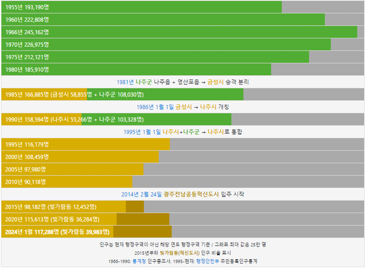 나주시 인구는 1955년 19만명 이었습니다. 그리고 1966년 24만명으로 가장 많은 인구가 거주했고 이후 인구가 계속해서 감소하다가 최근 빛가람혁신도시 입주로 인구가 다시 증가하고 있습니다. 2024년 현재 11만명이 나주시에 거주하고 있습니다.
