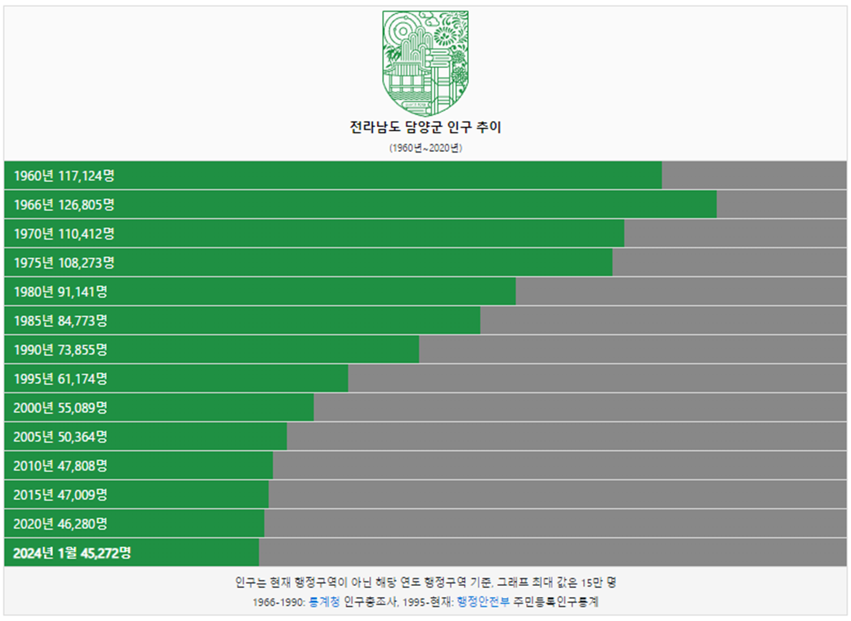 담양군 인구는 1960년 11만명 이었습니다. 이후 인구 증가없이 계속해서 인구가 감소했습니다. 2024년 현재 4만명이 담양군에 거주하고 있습니다.