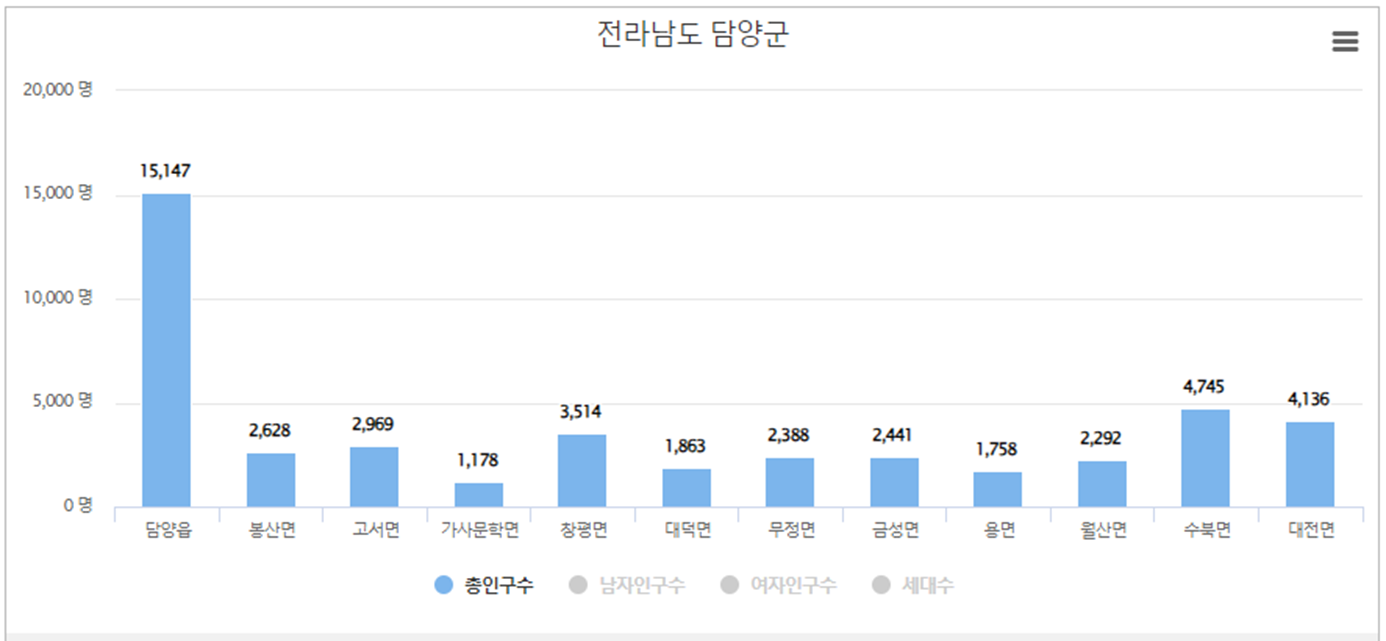 담양군에서 담양읍 인구가 가장 많으며 인구는 15,147 명, 세대수는 7,590 입니다. 두번째로는 수북면 인구가 많고 인구 4,745 명, 세대수는 2,377 입니다. 세번째는 대전면으로 인구는 4,136 명, 세대수는 2,160 입니다.