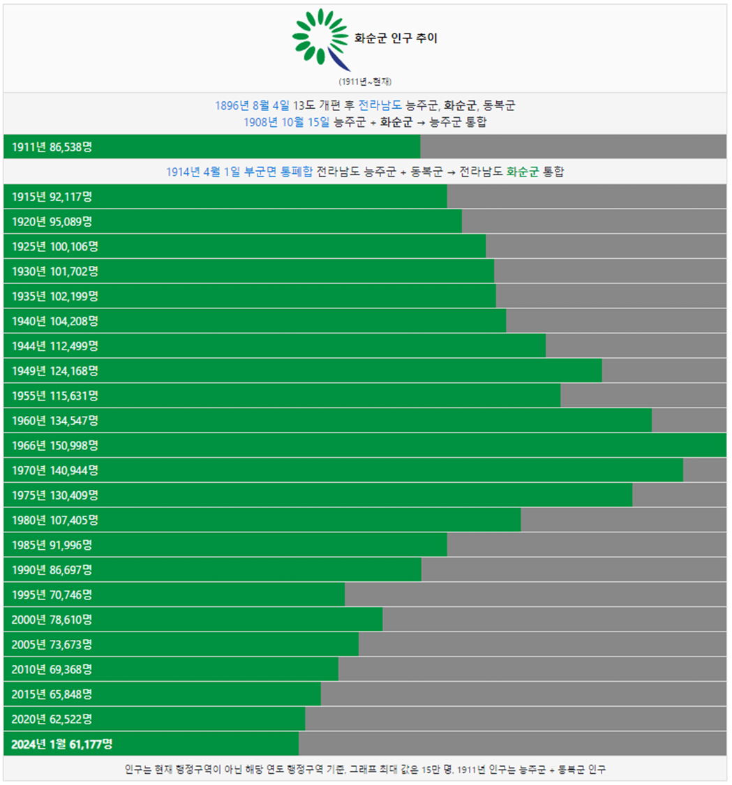 화순군 인구는 1966년 15만명 이었습니다. 그리고 1985년 인구가 처음으로 10만명 이하로 감소했고 이후 인구가 계속해서 감소했습니다. 2024년 현재 6만명이 화순군에 거주하고 있습니다.