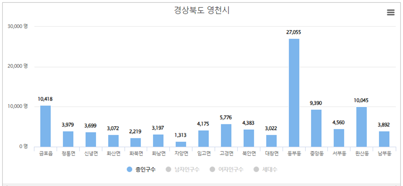 영천시에서 동부동 인구가 가장 많으며 인구는 27,055 명, 세대수는 13,165 입니다. 두번째로는 금호읍 인구가 많고 인구 10,418 명, 세대수는 6,271 입니다. 세번째는 완산동으로 인구는 10,045 명, 세대수는 4,577 입니다.