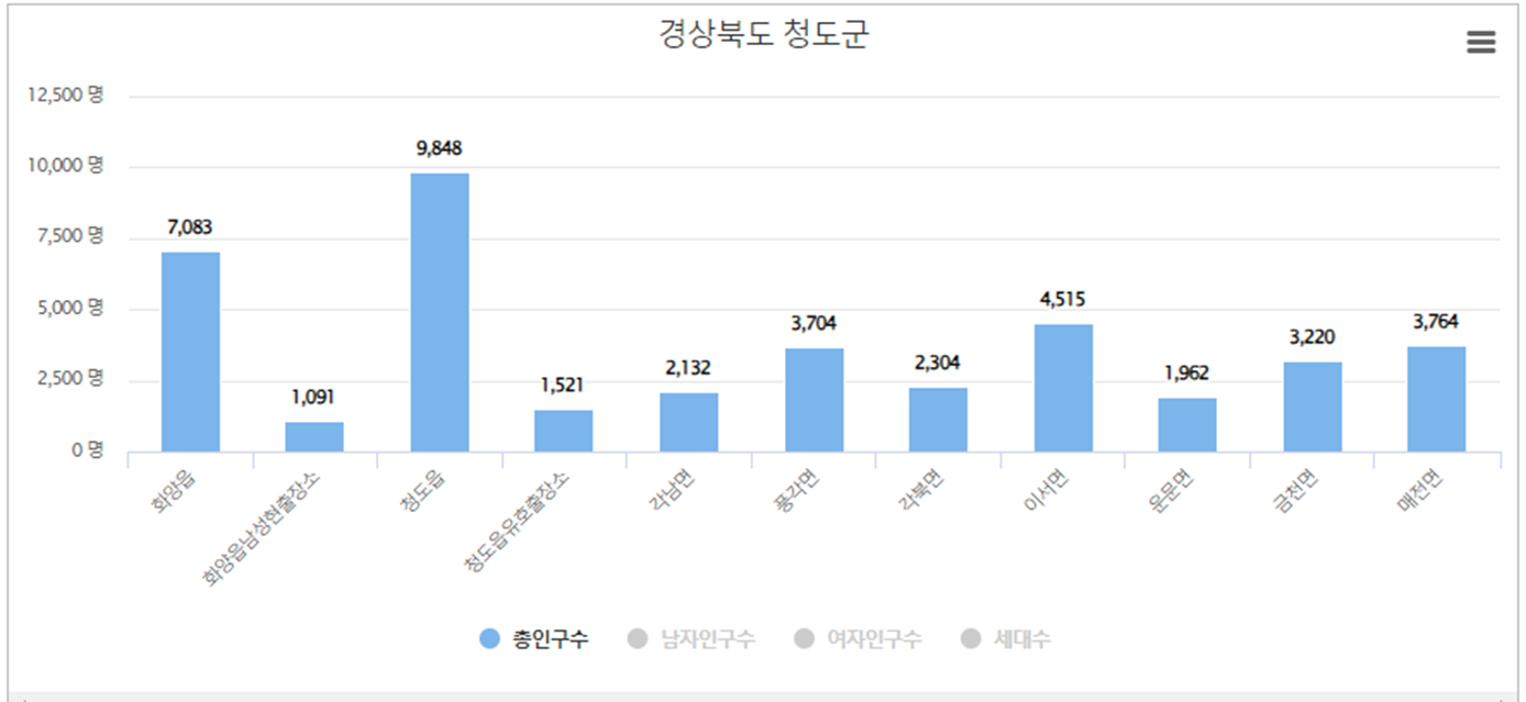 청도군에서 청도읍 인구가 가장 많으며 인구는 9,848 명, 세대수는 5,124 입니다. 두번째로는 화양읍 인구가 많고 인구 7,083 명, 세대수는 3,525 입니다. 세번째는 이서면으로 인구는 4,515 명, 세대수는 2,579 입니다.