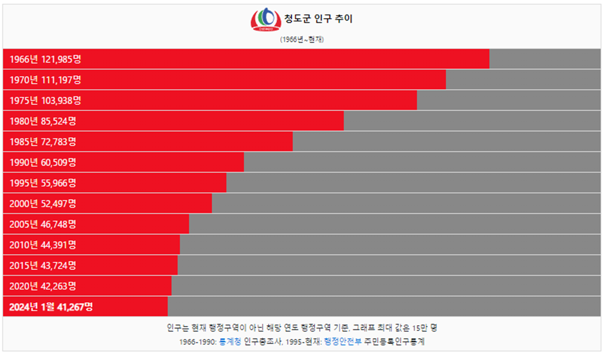 청도군 인구는 1966년 12만명 이었습니다. 그리고 2005년 인구가 처음으로 5만명 이하로 감소했고 이후 인구가 계속해서 감소했습니다. 2024년 현재 4만명이 청도군에 거주하고 있습니다.