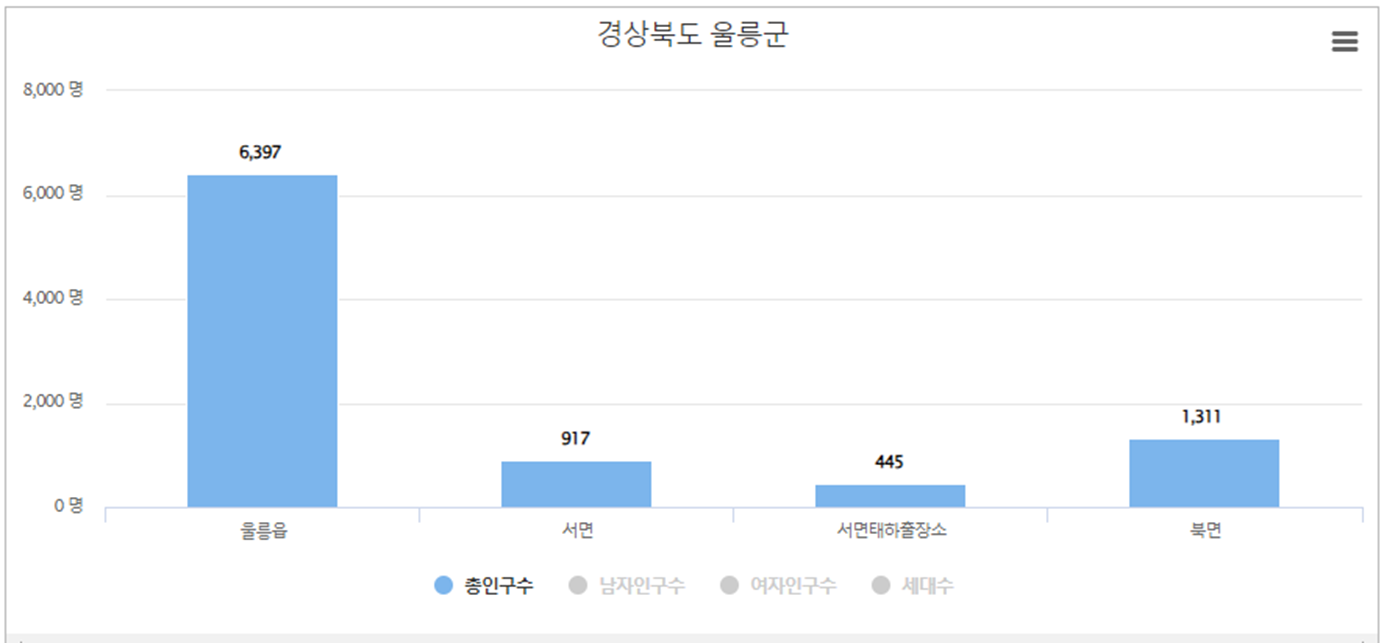울릉군에서 울릉읍 인구가 가장 많으며 인구는 6,397 명, 세대수는 3,967 입니다. 두번째로는 북면 인구가 많고 인구 1,311 명, 세대수는 877 입니다. 세번째는 서면으로 인구는 917 명, 세대수는 528 입니다.