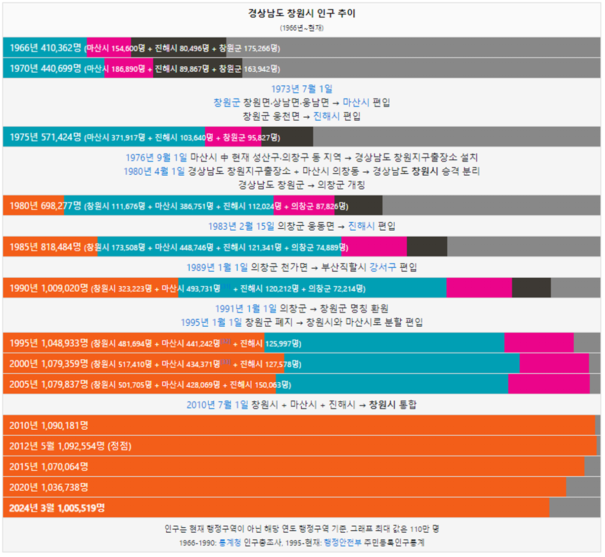 창원시(마산시+진해시+창원군) 인구는 1966년 41만명 이었습니다. 그리고 1990년 인구가 처음으로 100만명 이상이 되었고 이후 비슷한 인구수를 유지하고 있습니다. 2024년 현재 100만명이 창원시에 거주하고 있습니다.