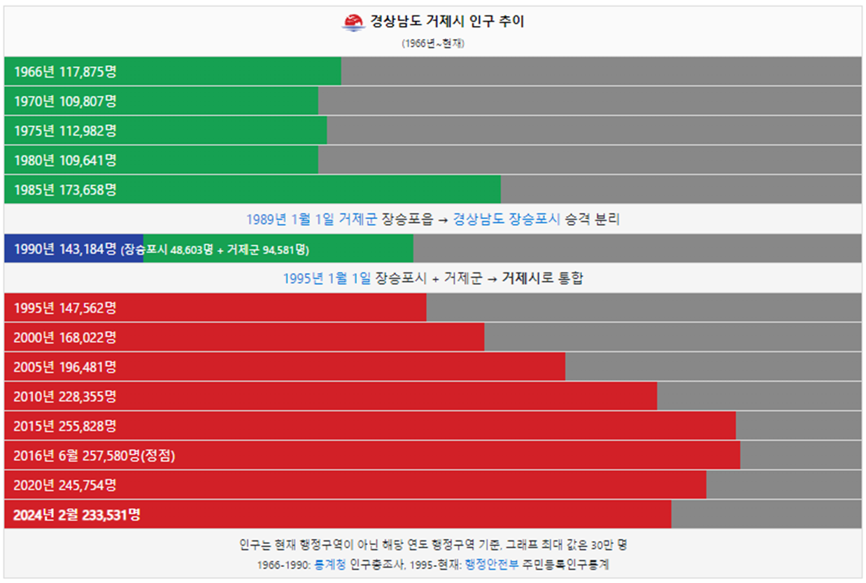 거제시 인구는 1966년 11만명 이었습니다. 그리고 2015년 25만명 이상이 됐고 이후 크게 인구가 변화되지 않았습니다. 2024년 현재 23만명이 거제시에 거주하고 있습니다.