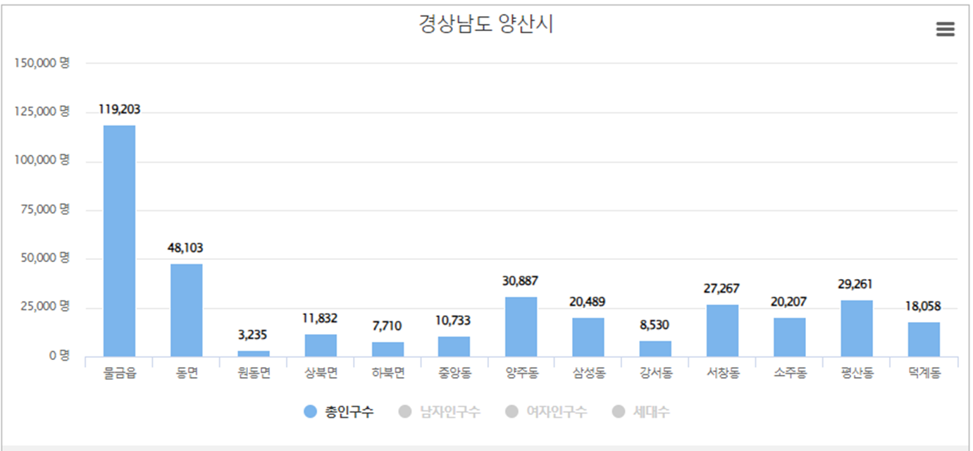 양산시에서 물금읍 인구가 가장 많으며 인구는 119,203 명, 세대수는 49,083 입니다. 두번째로는 동면 인구가 많고 인구 48,103 명, 세대수는 20,641 입니다. 세번째는 양주동으로 인구는 30,887 명, 세대수는 12,794 입니다.