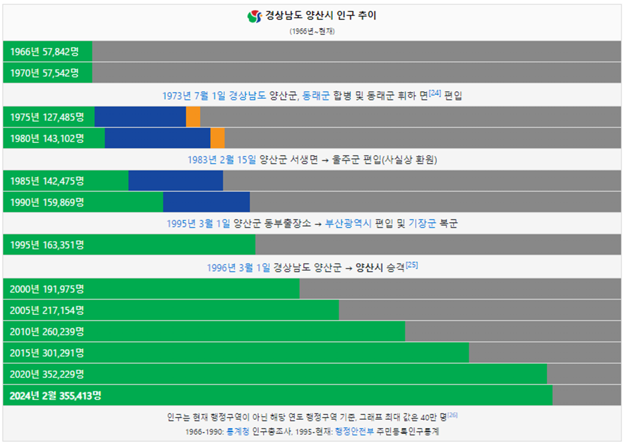 양산시 인구는 1966년 5만명 이었습니다. 그리고 2015년 인구가 처음으로 30만명 이상이 됐고 이후에도 인구가 꾸준히 증가했습니다. 2024년 현재 35만명이 양산시에 거주하고 있습니다.