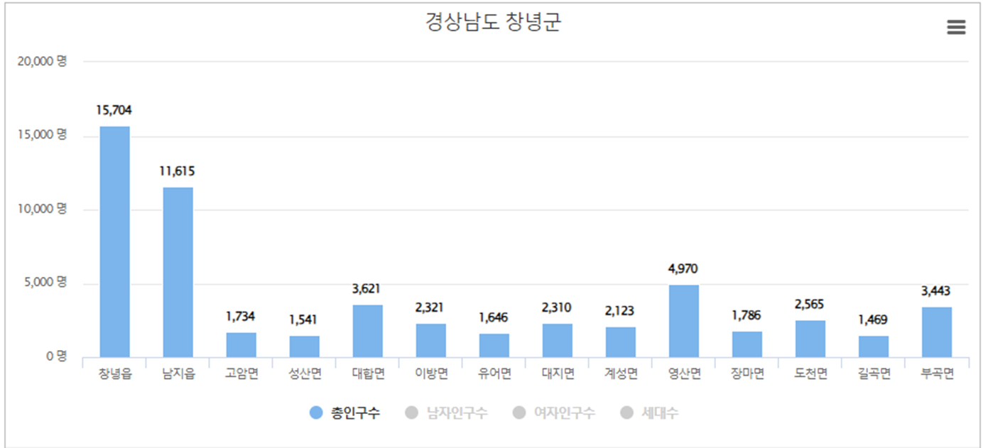 창녕군에서 창녕읍이 인구가 가장 많으며 인구는 15,704 명, 세대수는 7,926 입니다. 두번째로는 남지읍 인구가 많고 인구 11,615 명, 세대수는 6,071 입니다. 세번째는 영산면으로 인구는 4,970 명, 세대수는 2,774 입니다.