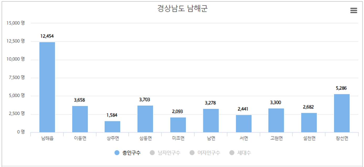 남해군에서 남해읍이 인구가 가장 많으며 인구는 12,454 명, 세대수는 6,186 입니다. 두번째로는 창선면 인구가 많고 인구 5,286 명, 세대수는 3,065 입니다. 세번째는 삼동면으로 인구는 3,703 명, 세대수는 2,188 입니다.