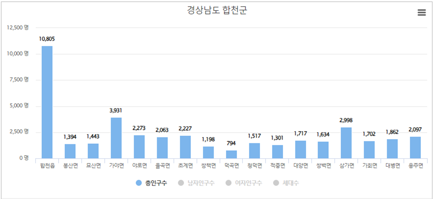 합천군에서 합천읍이 인구가 가장 많으며 인구는 10,805 명, 세대수는 5,294 입니다. 두번째로는 가야면 인구가 많고 인구 3,931 명, 세대수는 2,276 입니다. 세번째는 삼가면으로 인구는 2,998 명, 세대수는 1,839 입니다.