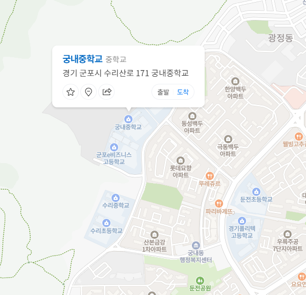 군포시에서 특목고에 가장 많이 진학한 학교는 궁내중학교로 경기도 군포시 수리산로 171번지에 위치합니다. 궁내중학교의 학생수는 250명이며 과학고는 2명, 외고는 12명, 자사고에는 11명이 진학했습니다. 궁내중학교의 전체 학생 중 10%인 25명이 특목고에 진학했습니다.