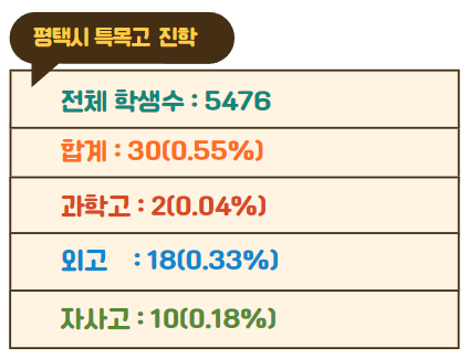 2022년 기준 평택시(고덕) 지역에는 25개 중학교가 있고 중학교 학생수는 5476명입니다. 전체 학생 중 0.04%인 2명이 과학고에 진학했고 0.33%인 18명이 외국어고에 진학했습니다. 그리고 0.18%인 10명이 자립형 사립고에 진학했습니다. 전체 학생수 5476명 중 0.55%인 30명이 특목고에 진학했습니다.